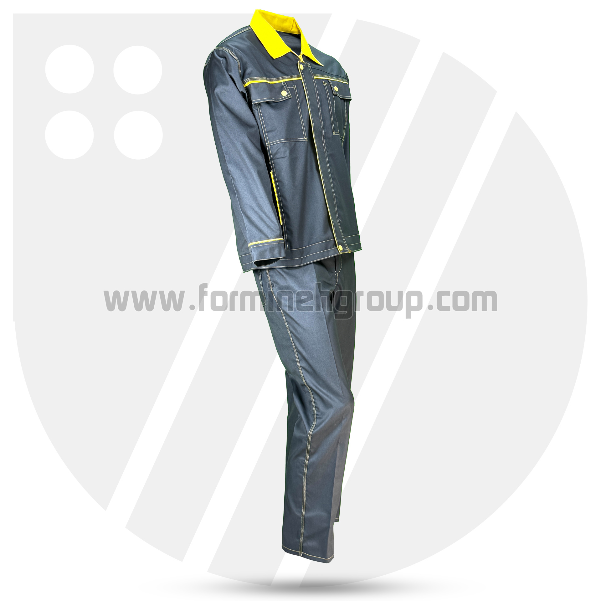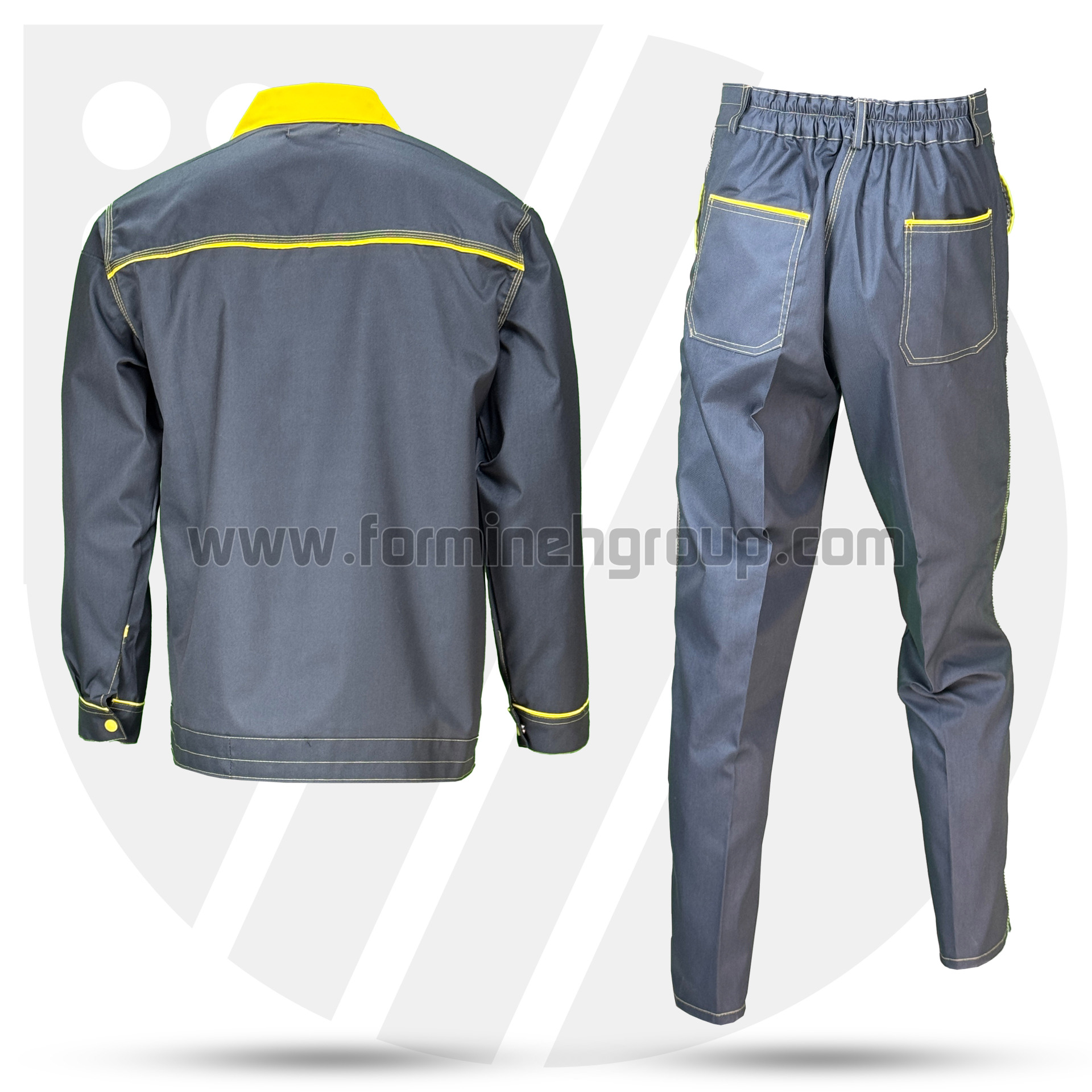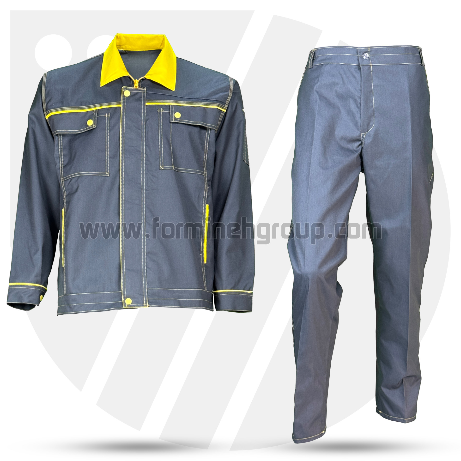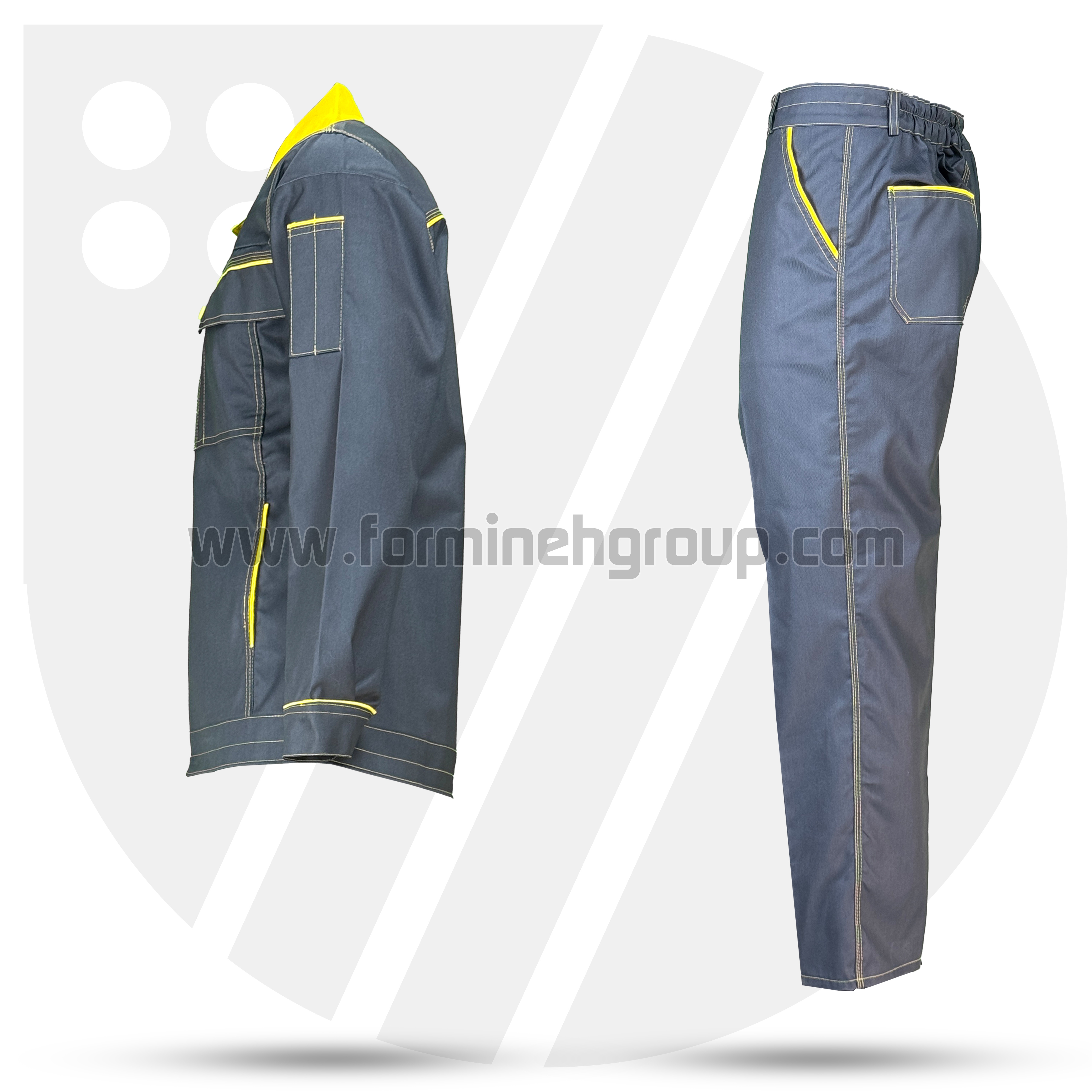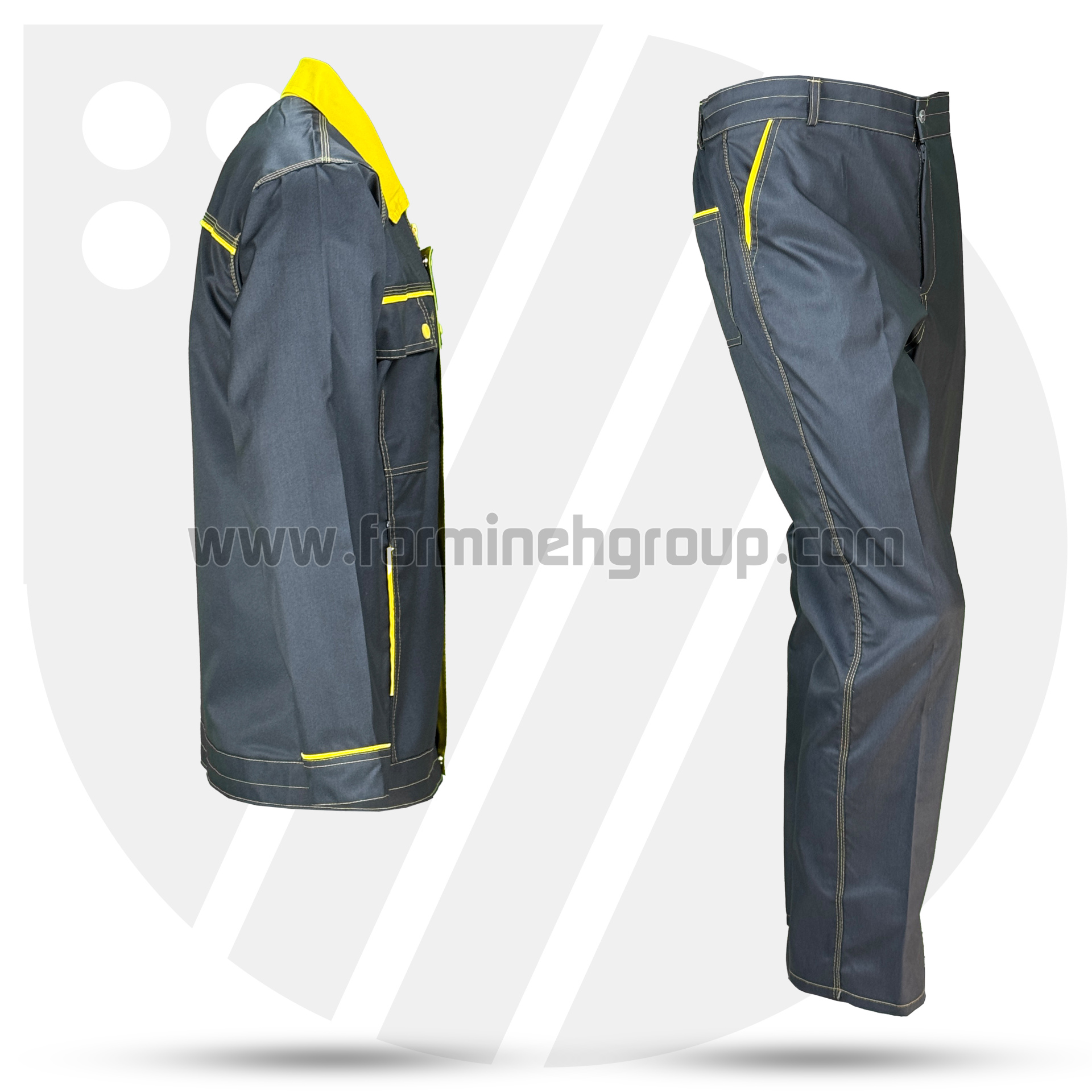 لباسکار دو تکه ویژن (طوسی/ زرد)، تولید شده با پارچه کجراه ویسکوز/ فلامنت با دوام بالا و دوخت تمام صنعتی است.